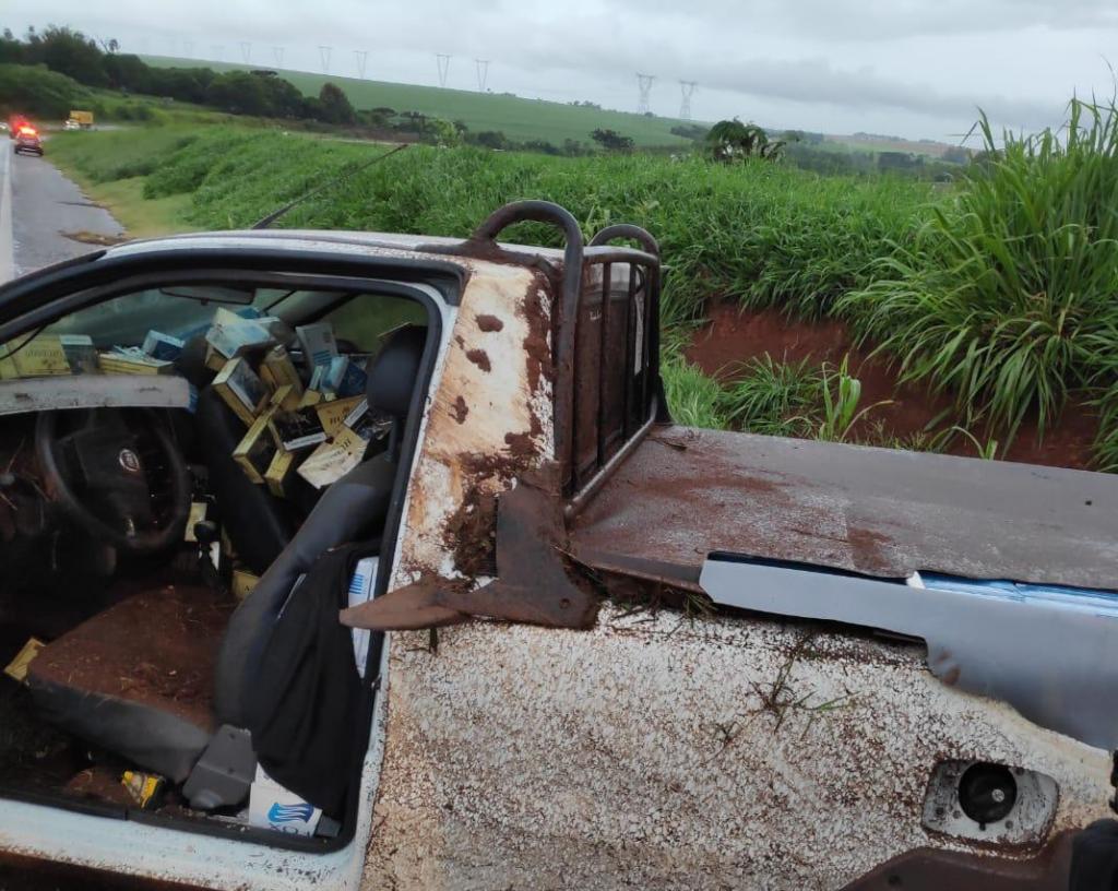 Um veículo Fiat Strada carregado com cigarros foi apreendido na manhã desta quarta-feira (14), pela equipe do BPFron, após capotar em Cascavel.