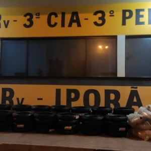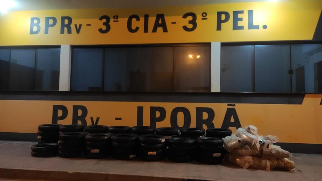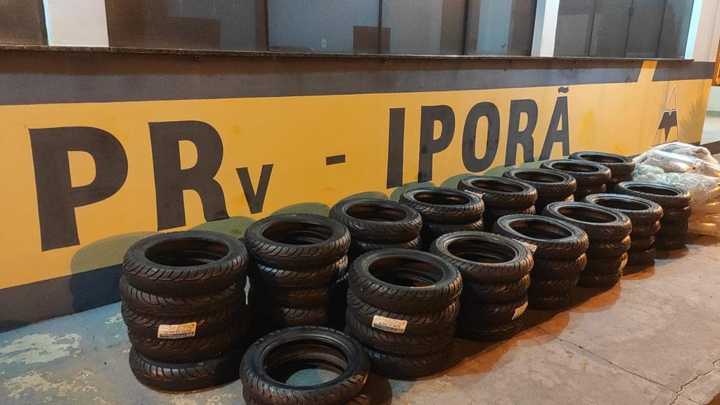Ao vistoriar o compartimento de carga foram encontrados ainda vários pneus e acessórios totalizando 66 e 65 paralamas para motos.