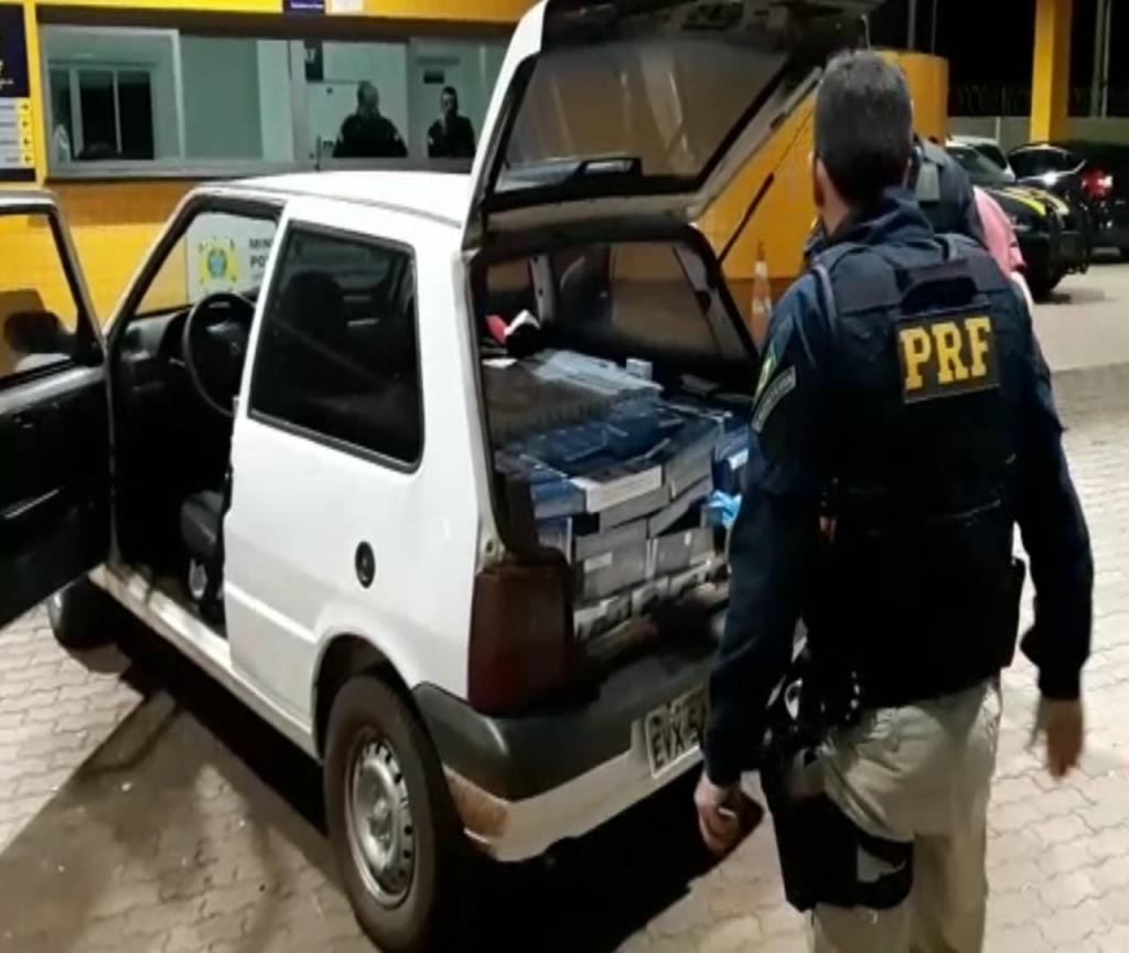 Após acompanhamento tático de alguns quilômetros o veículo parou no acostamento e dentro maços de cigarros contrabandeados do Paraguai.
