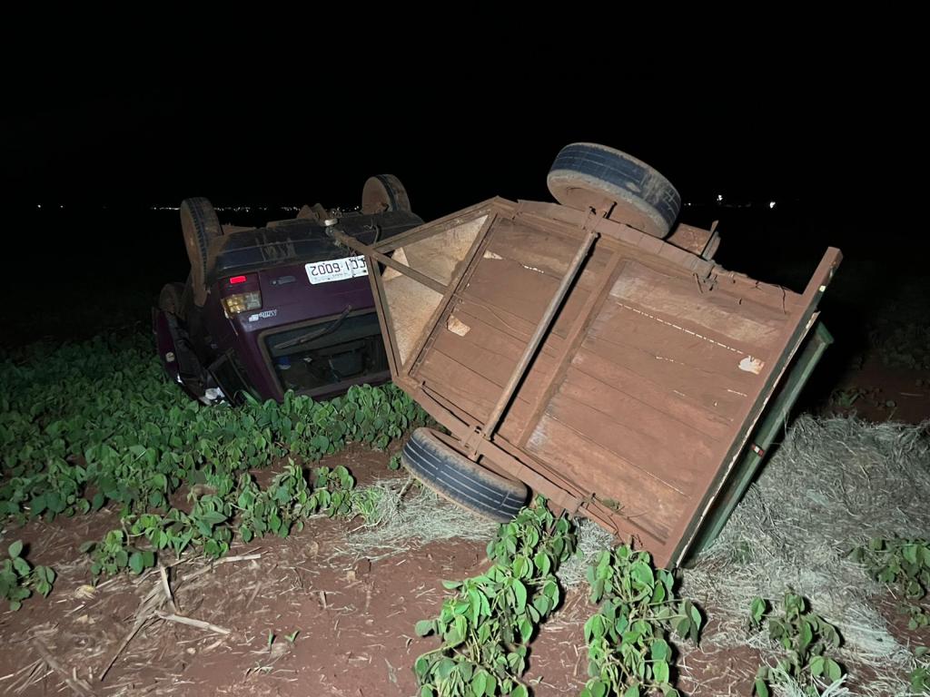 Segundo o relato do condutor, ele foi buscar feno para seu cavalo e na volta, quando seguia sentido ao trevo, um veículo na pista contrária deu luz alta e tirou a visão do motorista, que na sequencia saiu da pista e tombou o veículo com uma carretinha engatada carregada de alimento para o animal.