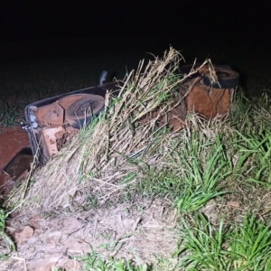 Em uma curva o motorista perdeu o controle de direção e saiu da pista e tombou dentro de uma valeta próximo a uma plantação de milho.