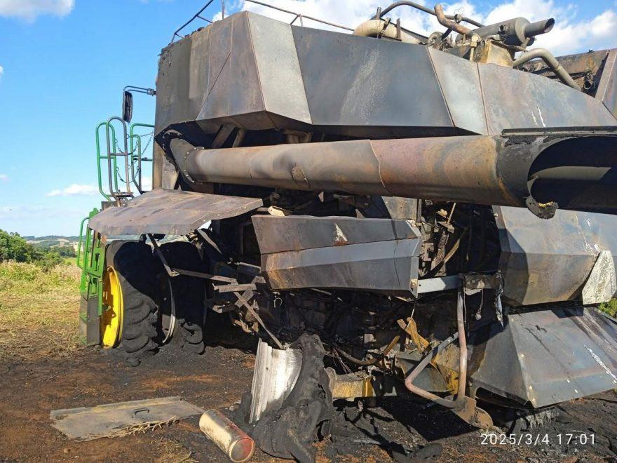 Um incêndio de proporções significativas consumiu uma colheitadeira na tarde desta terça-feira (4) em uma propriedade rural localizada próxima à Piracanjuba, na região da família Hasse, em São Jorge D’Oeste.