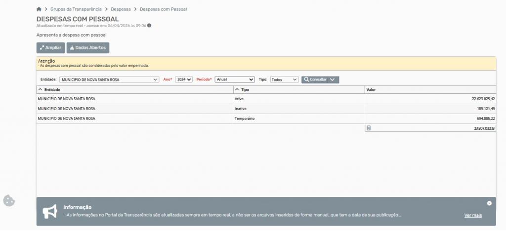 A evolução da folha de pagamento da Prefeitura de Nova Santa Rosa nos últimos anos revela um crescimento consistente nos gastos com pessoal. Dados do Portal da Transparência mostram que, de 2024 para 2025, houve um aumento significativo, e a tendência é de nova elevação em 2026, impulsionada principalmente pelo concurso público realizado neste ano.