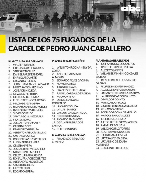 A ministra Cecilia Pérez anunciou que as ações serão "sem contemplação" para todos os envolvidos no esquema de corrupção que resultou na fuga de 76 presos da Penitenciária Pedro Juan Caballero. É anunciada uma intervenção do sistema penitenciário e as forças públicas cercam os centros penitenciários considerados "mais problemáticos", onde há presença de membros do Primeiro Comando da Capital (PCC).
