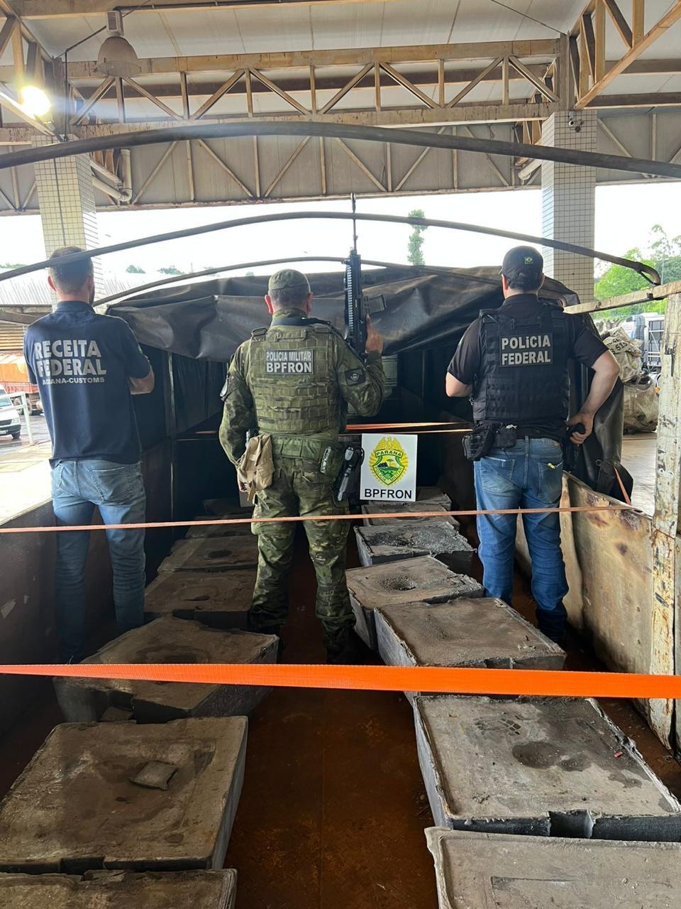A atuação integrada entre o Batalhão de Polícia de Fronteira (BPFron), Polícia Federal e Receita Federal resultou na apreensão de uma carreta carregada com aproximadamente 31 toneladas de blocos de chumbo em Santo Antônio do Sudoeste. A ação ocorreu após informações indicarem movimentação atípica em um galpão industrial localizado às margens da BR-163.