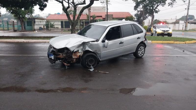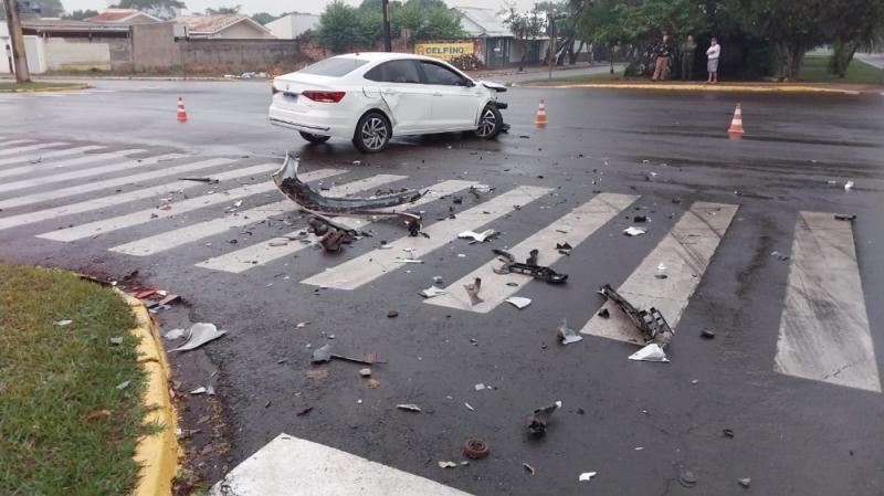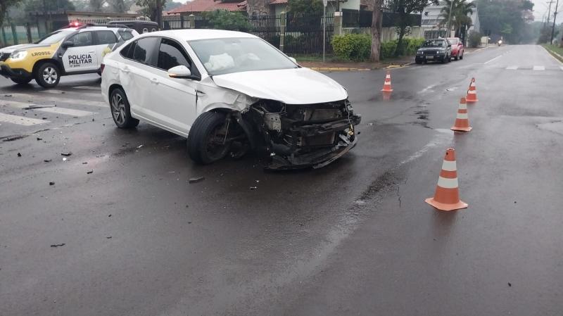 Uma forte colisão envolvendo um VW/Gol e um VW/Jetta foi registrada, nesta quinta-feira (08), no cruzamento da Rua Ministro Gabriel Passos com a Avenida Marcelino Rolon, em Guaíra.