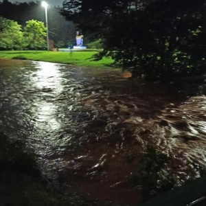A Sanga Panambi transbordou por cima da pista, alagando aproximadamente 100 metros das duas vias, tumultuando o tráfego de veículos.