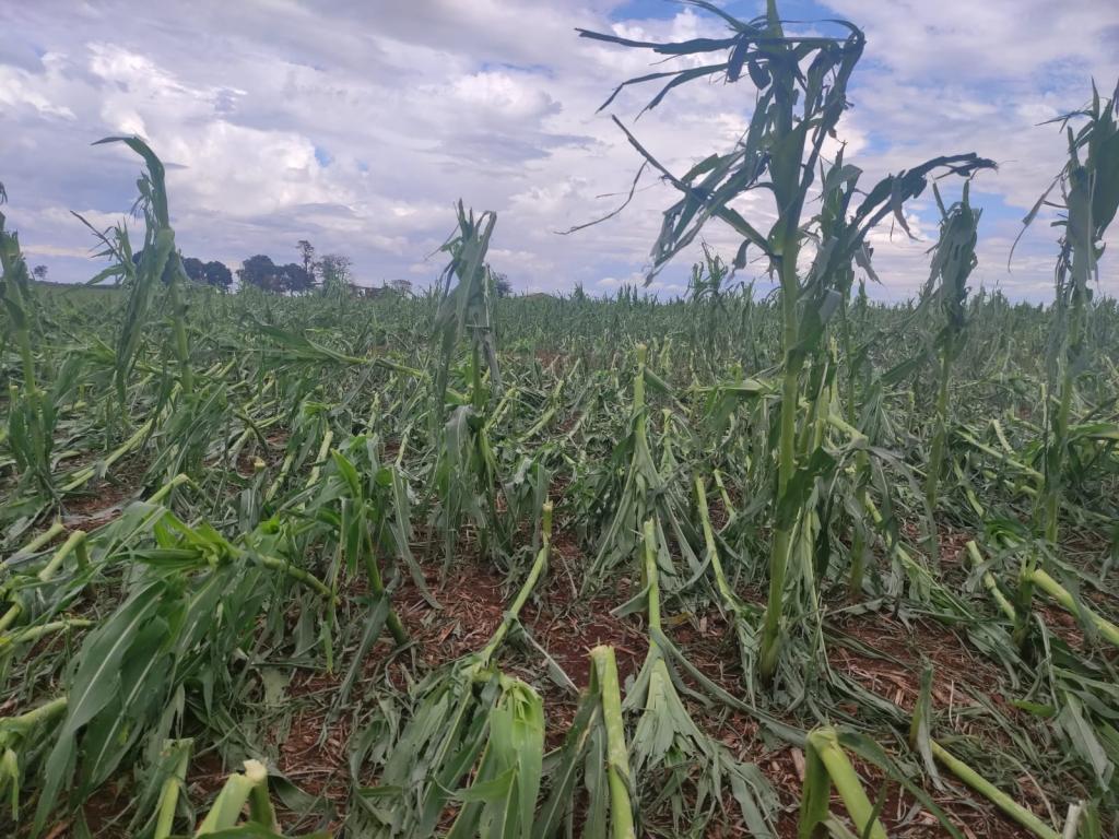 Em São Miguel do Iguaçu, uma lavoura de milho foi atingida pelo temporal deixando a plantação ao chão.