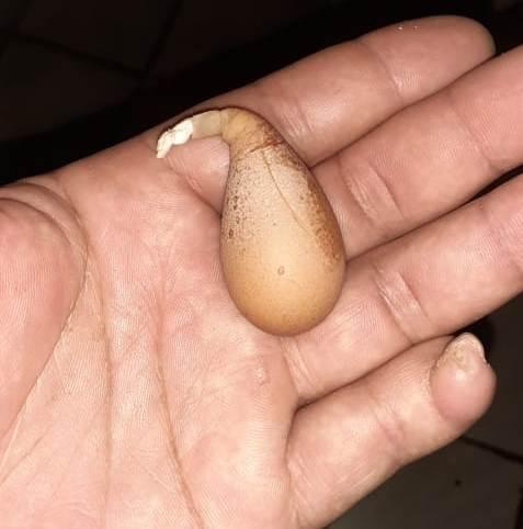 Ele cria galinhas e hoje uma delas botou um ovo com formato diferente, como se tivesse uma ponta. Ele comenta que é a primeira vez que acontece. O ovo também é menor que o comum.