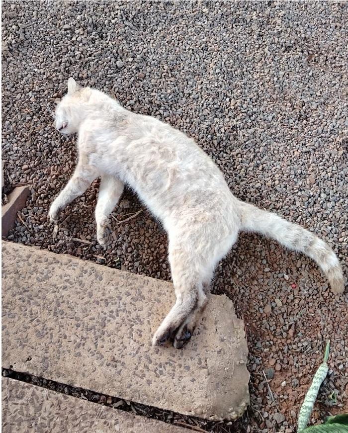 A suspeita de envenenamento ganhou força após a morte repentina do animal. O corpo foi encontrado por um vizinho no pátio da própria casa, sem sinais visíveis de agressão ou ferimentos, apenas com a língua para fora e já com a presença de formigas. Moradores relataram ainda que outro gato da mesma família havia desaparecido meses antes, em circunstâncias semelhantes.