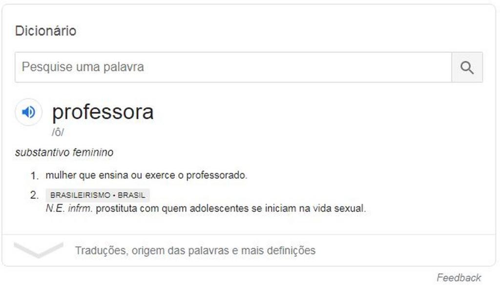 O resultado da busca no Google para a palavra "professora" virou alvo de críticas nas redes sociais e entre entidades ligadas aos docentes. Além do significado tradicional, que é “mulher que leciona”, o site exibiu uma segunda definição logo depois da principal: “prostituta que inicia os adolescentes na vida sexual”. Após a repercussão negativa, o site de buscas editou o verbete e removeu nesta quarta-feira (23) a segunda definição, considerada pejorativa.