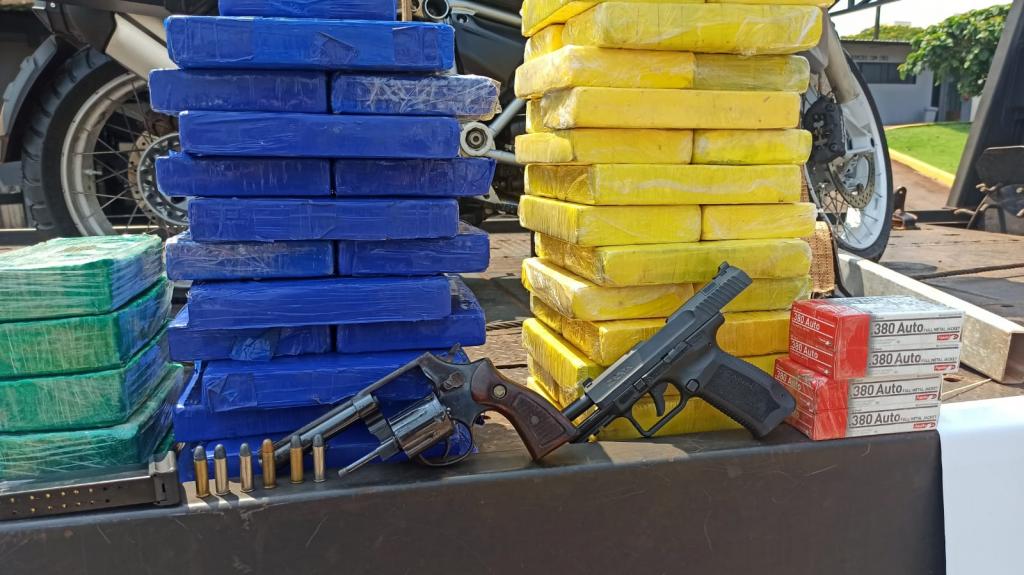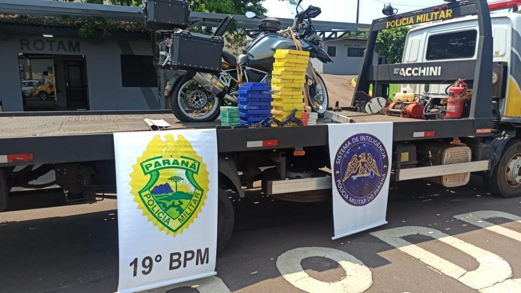 Com o apoio da Polícia Rodoviária Federal e viaturas de Toledo, foi possível abordar o condutor e constatar que o compartimento de bagagens da moto estava carregado com 67 kg de cocaína e 5 kg de crack. Também havia uma pistola calibre 9mm e um revólver calibre 38.