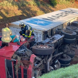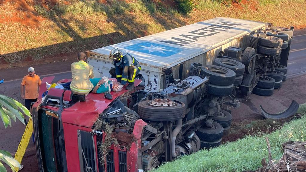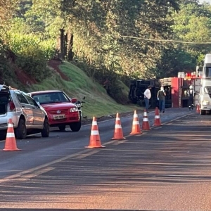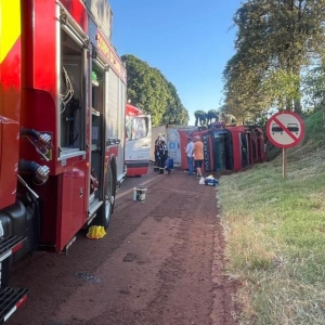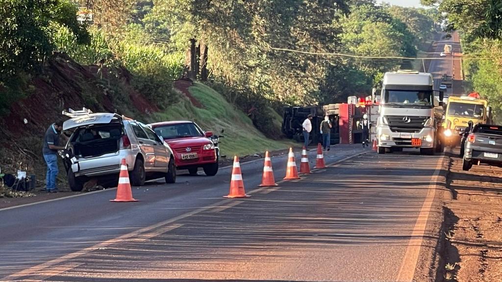 Envolveram-se neste acidente um veículo Pàlio e uma carreta. Com a força da batida, a carreta tombou sobre a pista.