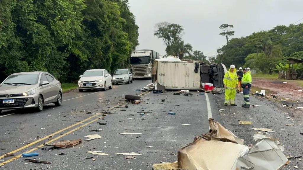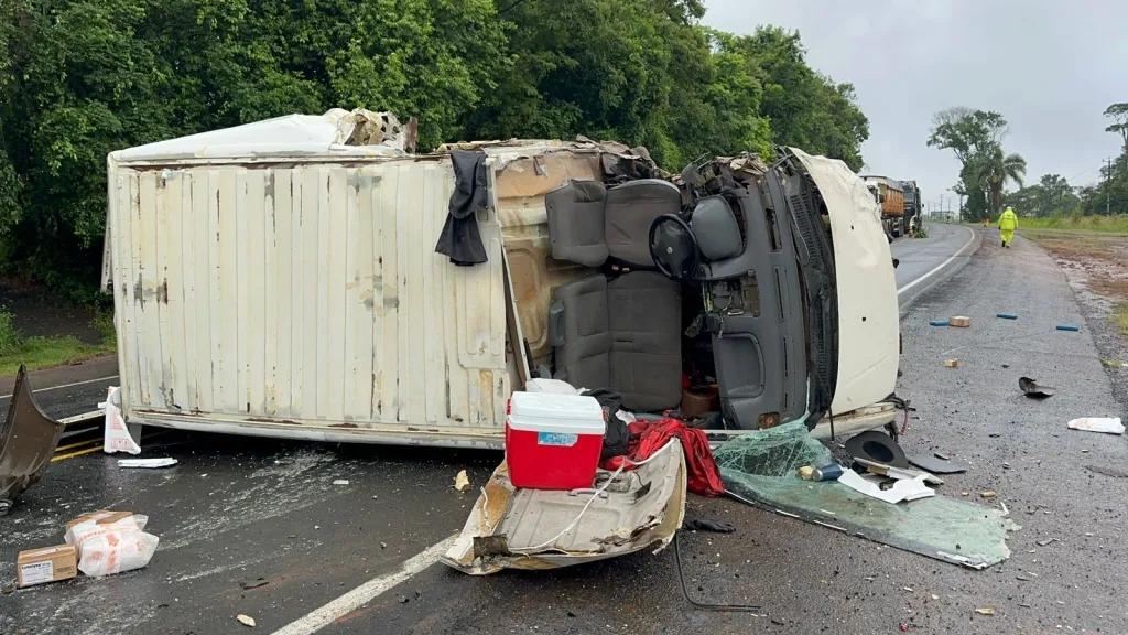 Após a colisão caminhão foi parar fora da pista e a Van tombou sobre a rodovia. O trânsito ficou interrompido durante o atendimento e depois foi desviado pelo acostamento no sistema pare e siga. A carga que estava na Van ficou espalhada na pista.