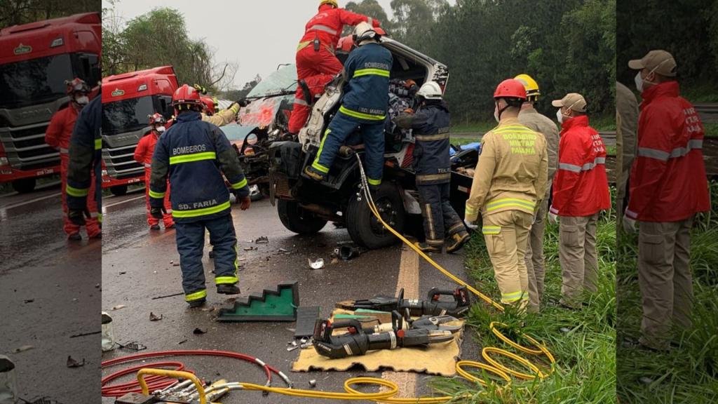O condutor de um caminhão plataforma, de 70 anos, ficou encarcerado e sofreu ferimentos moderados em grave acidente de trânsito entre caminhões no km 99 na BR 467, cerca de 500 metros de distância do Contorno Oeste, em Cascavel, na tarde desta quarta-feira (5).