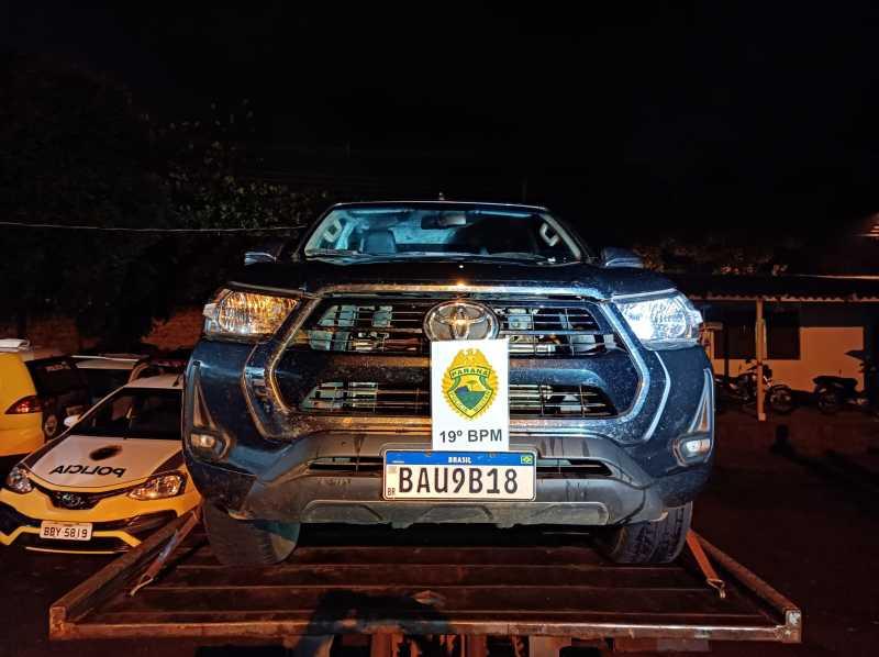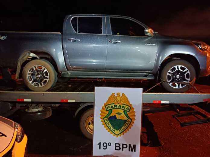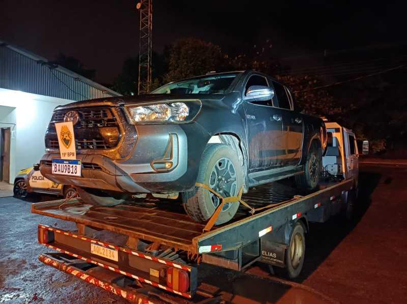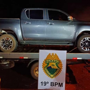Em vistoria os PMs constataram que a caminhonete Toyota/Hilux CD SRV A4FD, cor cinza, estava com placas falsas, sendo as verdadeiras RHB0E80, emplacada na cidade de Marialva/PR e com alerta de furto/roubo no dia 6 de maio.