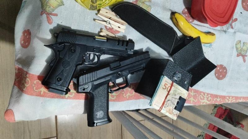 Na revista da casa, a PM encontrou dois simulacros de arma de fogo em um dos quartos, e R$ 3.550,00 em dinheiro em um cofre escondido no banheiro. As vítimas relataram que o autor havia feito disparos com uma arma de fogo, mas a PM não encontrou nenhuma arma real na residência.