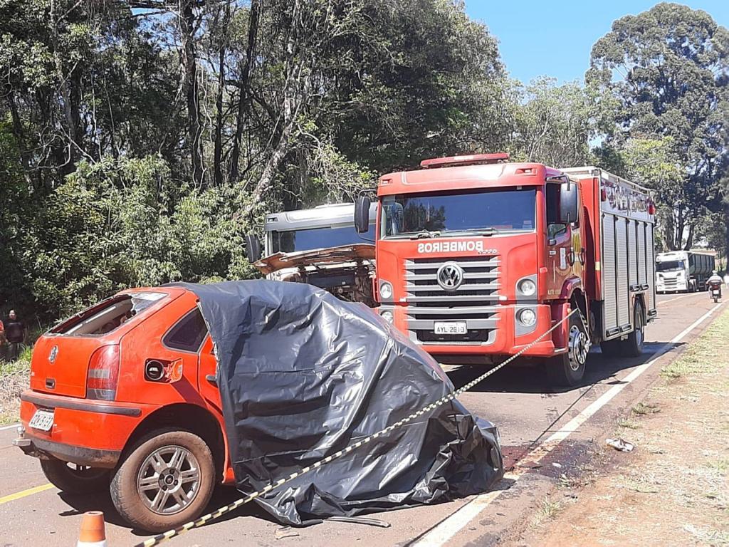 A batida frontal envolveu um caminhão tanque e um Gol, os dois veículos seguiam em sentidos opostos. As causas do acidentes estão sendo apuradas.