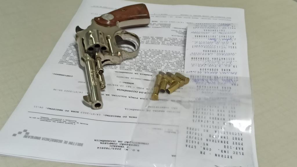 Em buscas no veículo foi encontrada uma arma de fogo, tipo revólver, calibre 22, com três munições intactas e quatro deflagradas embaixo do banco do motorista.