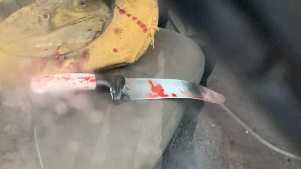 O criminoso, que estava junto com ele na picape, sacou uma faca e o agrediu com golpes na cabeça e mordidas. A vítima reagiu e entrou em luta corporal. Imagem acima mostra a faca usada no crime com marcas de sangue.