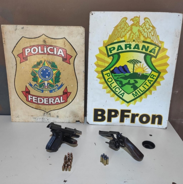 Um veículo foi abordado nesta quarta-feira em Foz do Iguaçu por policiais do BPFron juntamente com a Polícia Federal e durante a abordagem, no veículo foram encontrados um revólver calibre 38 com seis munições e uma pistola calibre .380 com 17 munições.
