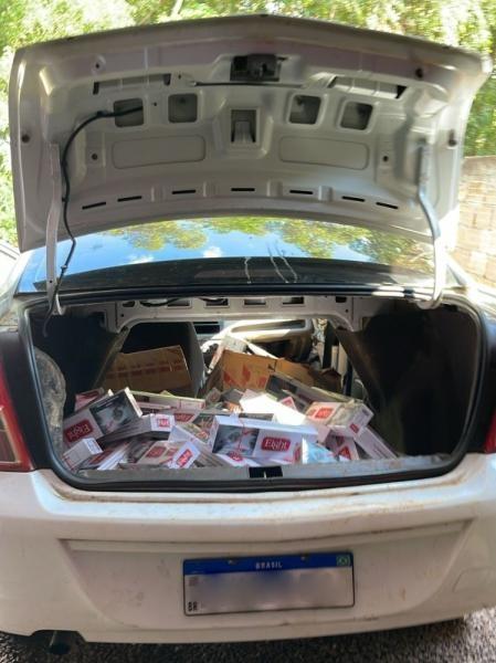 Ainda em diligências, a Polícia Militar foi até a residência, onde visualizou várias caixas de cigarros na garagem. Ao todo, foram apreendidas 24 caixas do produto contrabandeado do Paraguai.