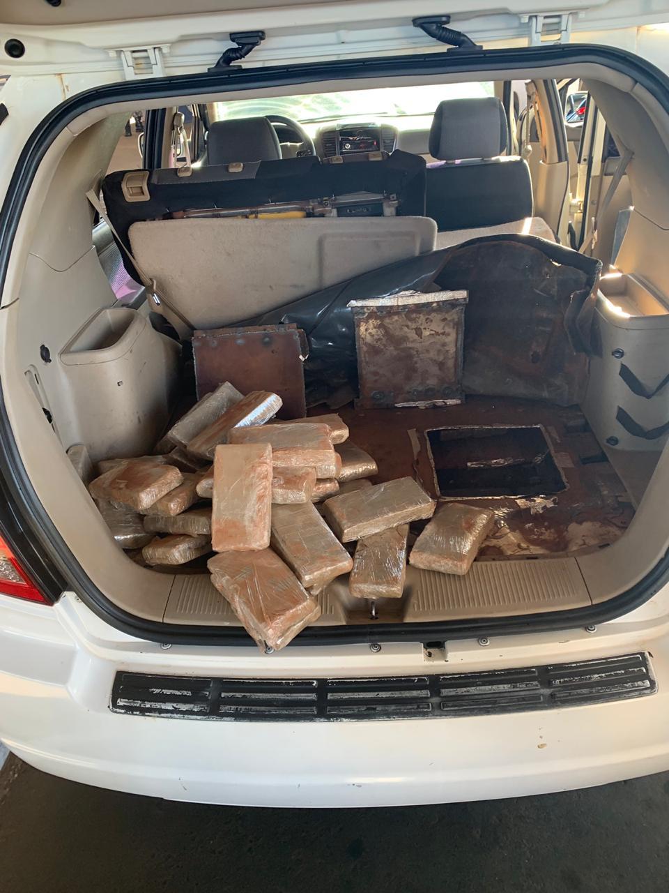 Ontem, durante ação da Operação Hórus Sul Policiais Militares do BPFron em conjunto com agentes da Receita Federal do Brasil e Força Nacional com apoio do Ministério da Justiça Secretária de Operações Integradas - SEOPI em abordagem ao condutor de 35 anos, que dirigia um carro Kia Sorento, durante busca no veículo foi identificado um fundo falso contendo diversos tabletes totalizando 200 kg de maconha.