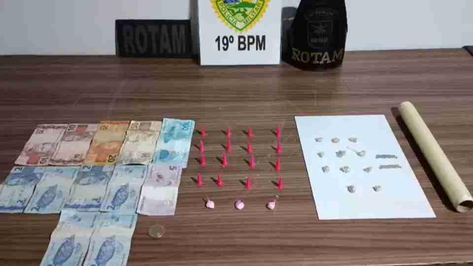 Durante patrulhamento nas proximidades, policiais da Rotam viram um suspeito que, ao notar a viatura, arremessou um objeto na calçada e tentou se esconder atrás de um carro estacionado. A equipe realizou a abordagem e encontrou no bolso da calça uma caixa metálica com 11 porções de crack, três porções de cocaína e R$ 208 em dinheiro. Dentro da carteira, os policiais localizaram um papel com uma chave Pix anotada.