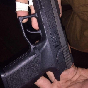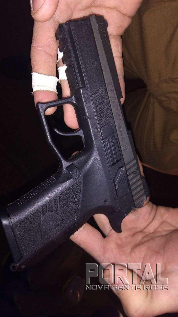 A arma usada pelo autor dos fatos foi identificada como sendo uma pistola da marca e modelo CZ 75 p-07, calibre .380, a qual estava carregada com uma munição na câmara e mais nove munições no carregador, pronta para o disparo. Foi verificado o local e constatado que em frente ao bar estava estacionado um veículo Renault Sandero de cor prata, o qual estava no nome da mãe do autor dos fatos.