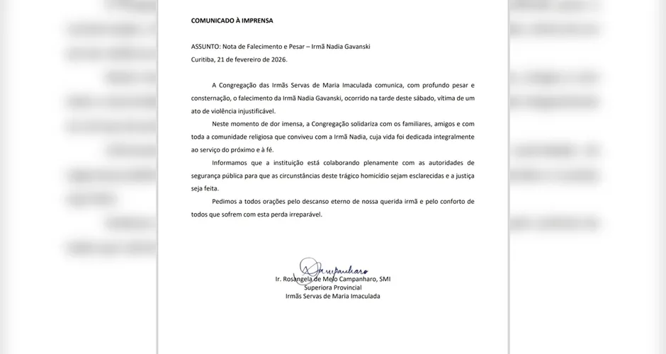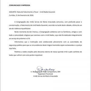 Na sequência, a PM conseguiu localizar e prender o suspeito nas imediações, no momento em que ele tentava fugir. O homem foi encaminhado para a delegacia local, onde o caso segue sob investigação para apurar todas as circunstâncias e a motivação exata do assassinato. O corpo de Irmã Nadia foi recolhido e levado ao Instituto Médico Legal (IML) de Ponta Grossa.