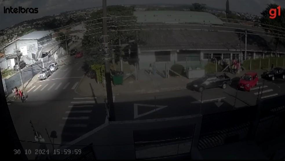 Uma câmera de segurança registrou o momento em que o homem correu para o próprio carro e deu uma ré brusca em direção ao carro da família enquanto elas chegavam no veículo.