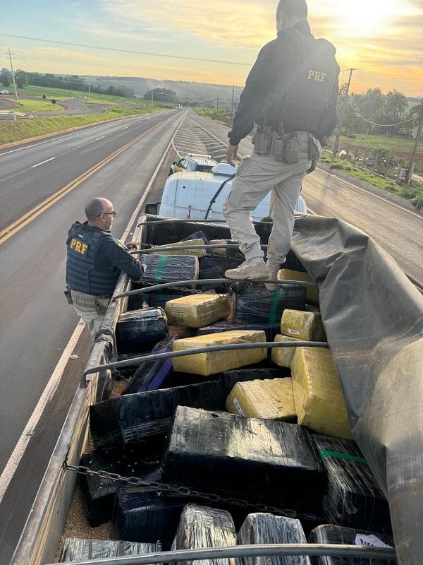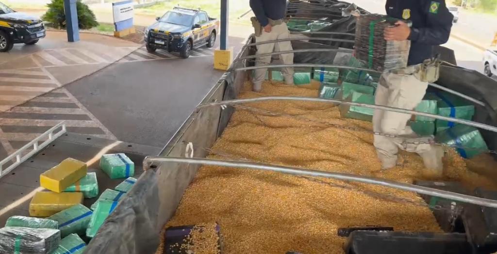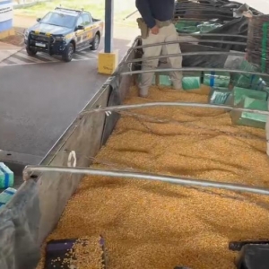 Contudo, ao removerem a lona que cobria a carga, os policiais encontraram 5.432 kg de maconha, escondidos sob os grãos. A droga foi pesada e encaminhada à Polícia Federal de Guaíra.