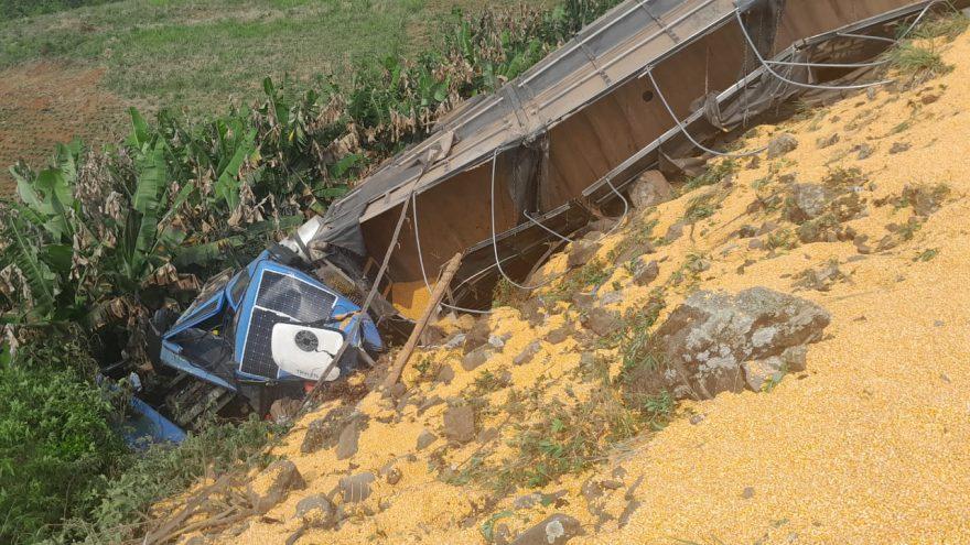 O choque entre os veículos foi tão violento que o caminhão acabou caindo em um barranco e pegou fogo. O motorista ficou preso nas ferragens e, infelizmente, veio a óbito no local. Para resgatar o corpo da vítima, foi necessário levantar a cabine do caminhão.