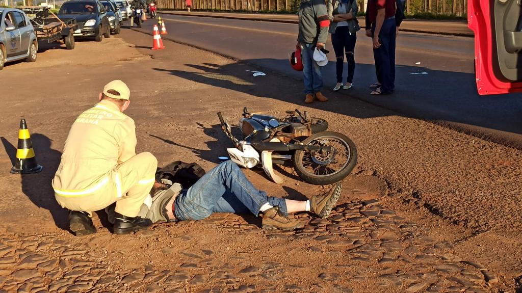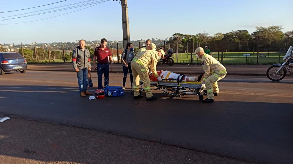 O condutor da moto Yamaha XTZ 125 cilindradas trafegava pela avenida e quando a idosa atravessou a via e foi atropelada, a senhora foi socorrida pelo corpo de bombeiros com uma liceraçåo na perna direita e também no braço direito com suspeita de fratura de costela.