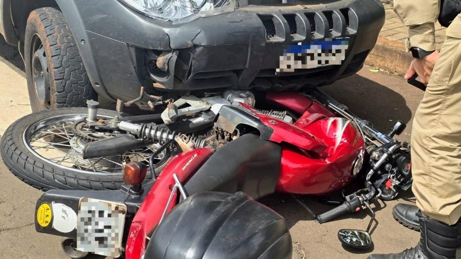 Com a força do impacto, a moto foi arrastada por alguns metros e ficou travada embaixo da parte frontal do carro.