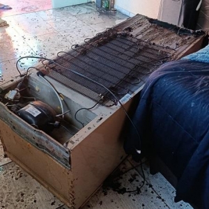 Apesar dos danos à geladeira e ao forro, outros móveis, como o fogão e a cama, não foram afetados.