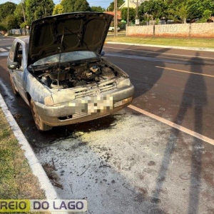 No final da tarde de ontem (17), um veículo modelo VW/Gol pegou fogo enquanto trafegava pela Rua Pará, em Santa Helena, próximo ao cruzamento com a Avenida São Paulo.