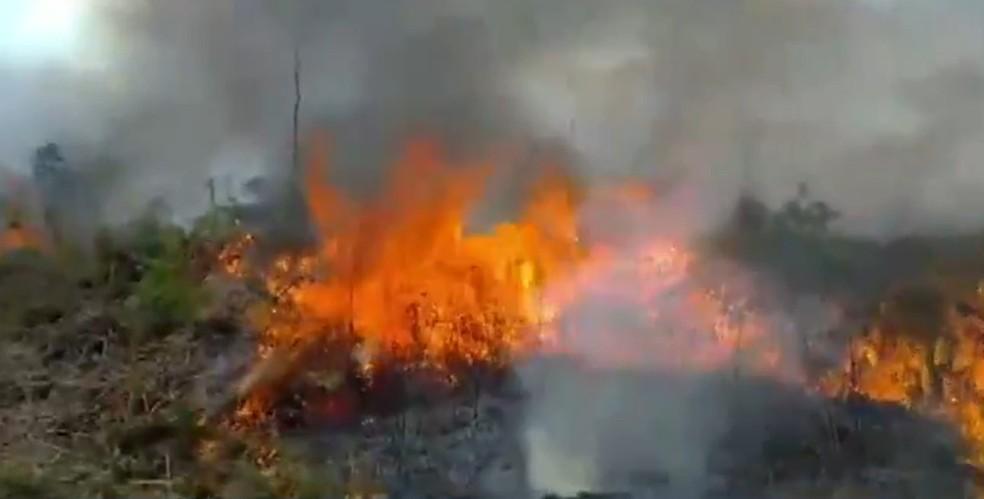 Após a ação da aeronave, com as chamas reduzidas, os brigadistas avançam por terra para combater as chamas. Até o começo da tarde desta terça-feira (21), a aeronave já havia feito quatro sobrevoos.
