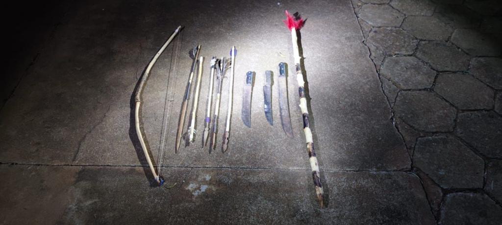 No local haviam um arco e flecha, três facões e uma lança adornada que foram encaminhados a Delegacia de Polícia Federal de Guaíra. Os indígenas contaram aos policiais militares que sofreram um ataque anteriormente, que uma pessoa com arma de fogo efetuou disparos contra a invasão e fugiu no meio da mata.
