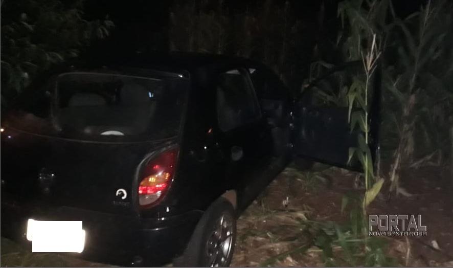 Na tentativa de abordagem, o Celta empreendeu fuga e adentrou um milharal, no final da Rua Pioneiro, cruzamento com a Avenida Shirley Saurin.