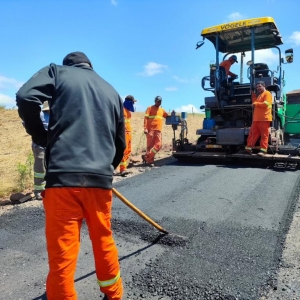 Antes de receber o revestimento em camada de asfalto CBUQ, servidores da prefeitura executaram a estrutura com uma base de 15 cm de rachãozinho, mais sub-base de 15 cm de pedra graduada compactada.