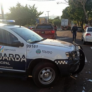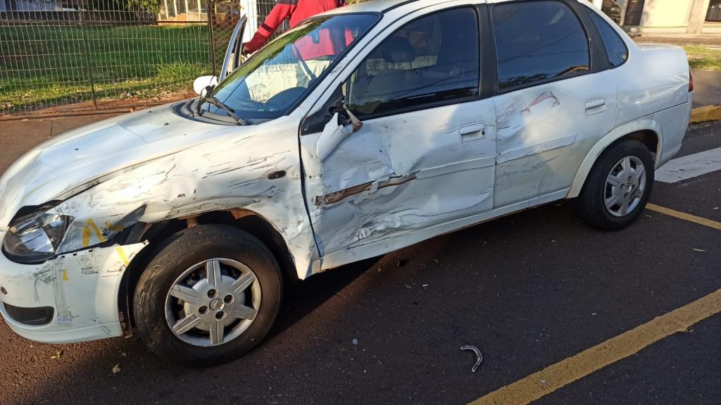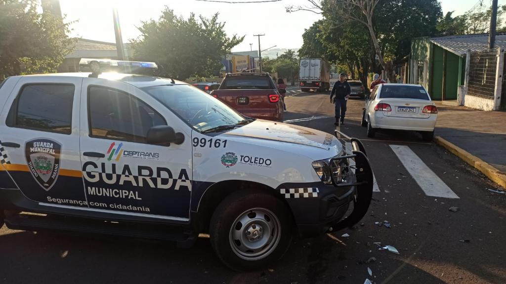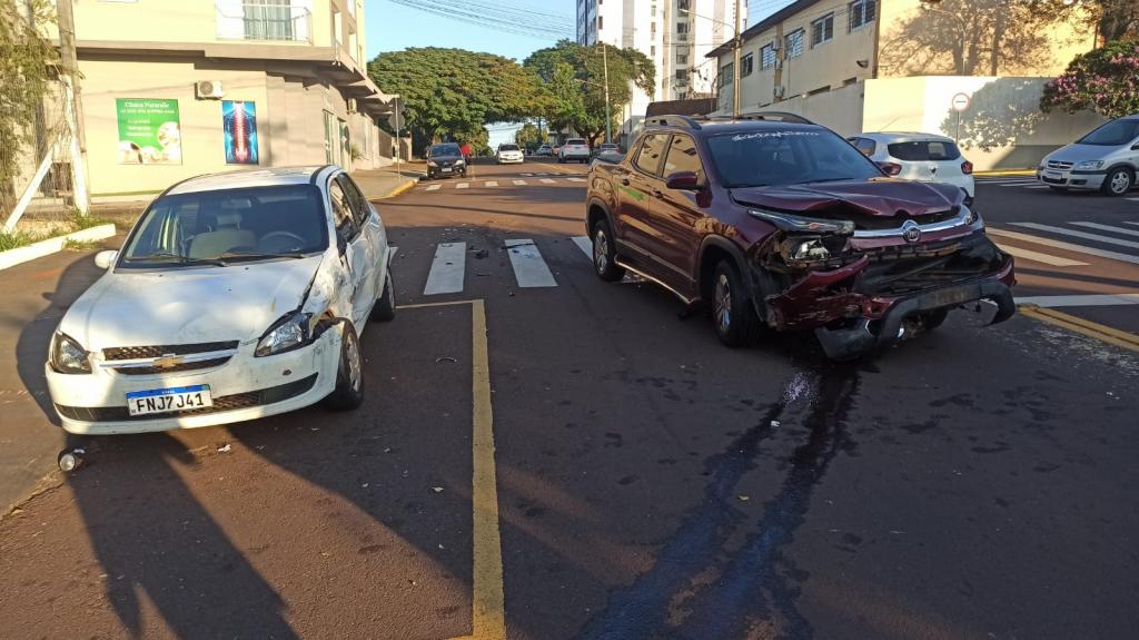 Um Fiat Toro e um Chevrolet Corsa colidiram na manhã desta sexta-feira no cruzamento da Rua Armando Luiz Arosi com Rua Almirante Barroso área central de Toledo.
