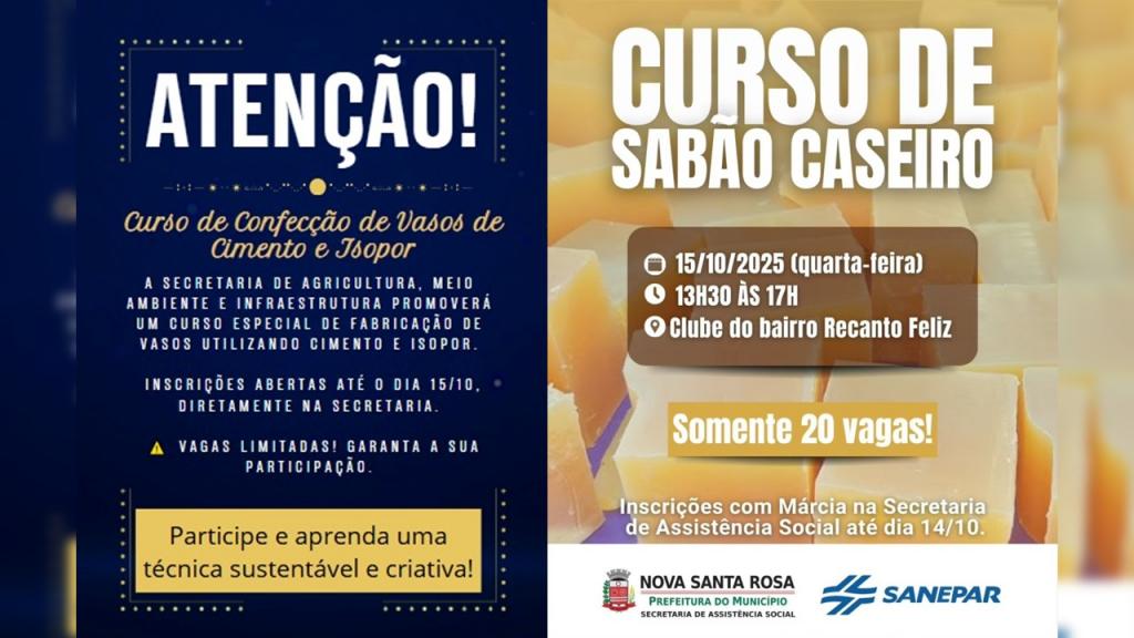 Já a Secretaria de Assistência Social, em parceria com a Sanepar, promove no dia 15 de outubro (quarta-feira) o curso de sabão caseiro. A atividade acontecerá no clube do bairro Recanto Feliz, das 13h30 às 17h, e busca incentivar práticas econômicas e sustentáveis, utilizando materiais reaproveitáveis na produção de sabão. Além de gerar economia doméstica, a iniciativa pode contribuir para a geração de renda extra e cuidado com o meio ambiente.