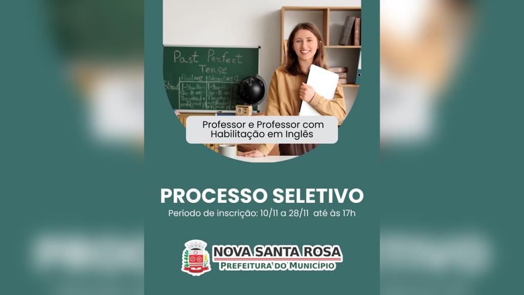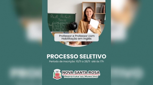 A Prefeitura de Nova Santa Rosa, por meio da Secretaria de Educação e Cultura, informa que abrirá na próxima segunda-feira (10), as inscrições para o Processo Seletivo Simplificado (PSS) visando a contratação de professores. As vagas são para os cargos de professor e professor com habilitação em Inglês.