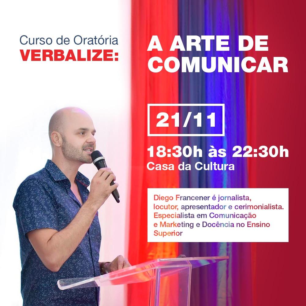 A idade mínima requerida é de 13 anos e todos os participantes receberão certificado. O curso, intitulado “Verbalize: a arte de se comunicar”, será ministrado das 18h30 às 22h30 desta quarta-feira pelo especialista em comunicação e marketing e jornalista, Diego Francener, na Casa da Cultura. Na ocasião, o profissional falará sobre técnicas de comunicação, comunicação verbal e não verbal, além de postura em entrevistas, gesticulação, microfone, enfrentamento e medo e prática. Em caso de desistência, o candidato deve informar com antecedência para que outro possa participar.
