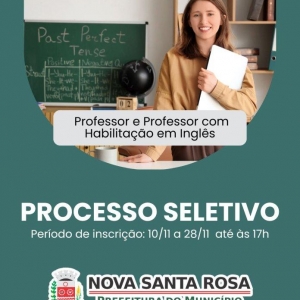 Seguem abertas até sexta-feira (28) as inscrições para o Processo Seletivo Simplificado (PSS) visando a contratação de professores. As vagas são para os cargos de professor e professor com habilitação em Inglês. O edital foi aberto pela Prefeitura de Nova Santa Rosa, por meio da Secretaria de Educação e Cultura.