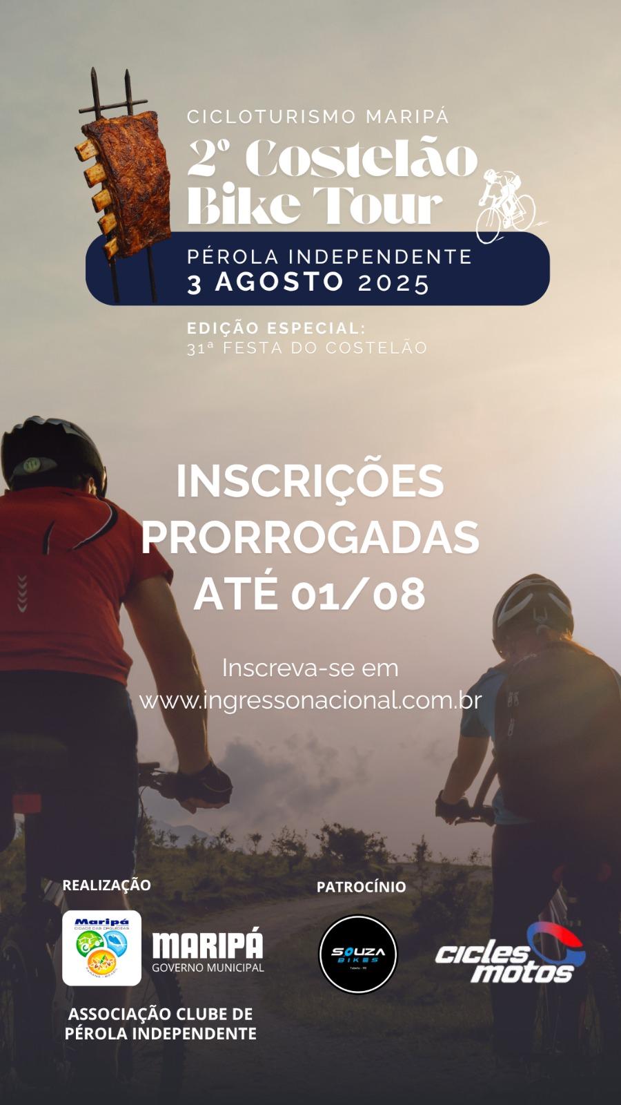 O 2º Costelão Bike Tour está chegando e ainda dá tempo de garantir sua vaga! As inscrições foram prorrogadas até o dia 1º de agosto no site www.ingressonacional.com.br. Não perca essa oportunidade de pedalar em meio à natureza e viver uma experiência única durante a 31ª Festa do Costelão, em Maripá - PR.