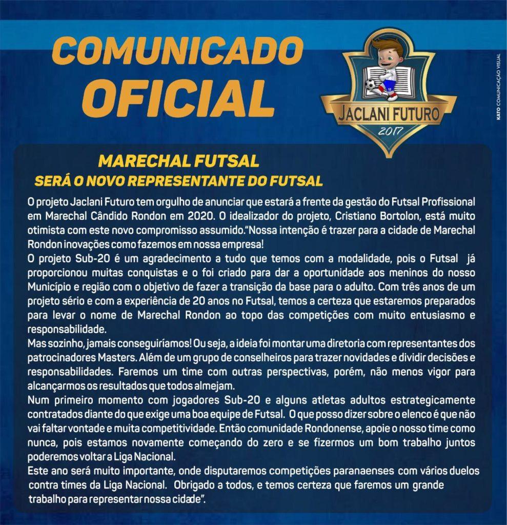 Através de nota oficial divulgada na tarde desta quarta-feira (22), o empresário Cristiano Bortolon anunciou oficialmente que a Jaclani Esportes estará à frente do projeto em 2020 e pediu o apoio da comunidade Rondonense. “Apoie nosso time como nunca, pois estamos novamente começando do zero e se fizermos um bom trabalho juntos, poderemos voltar à Liga Nacional de Futsal”.