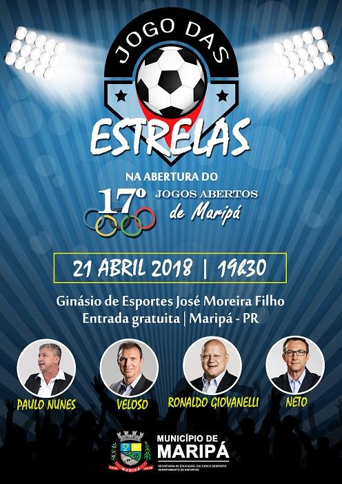 Em sua 17º edição, os Jogos Abertos de Maripá tem sua abertura marcada para este sábado (21), às 19h30 no Ginásio de Esportes José Moreira Filho. Além do desfile das oito delegações, será realizado o Jogo das Estrelas, com a participação dos craques do futebol brasileiro Neto, Ronaldo Giovanelli, Paulo Nunes e Veloso. A entrada será gratuita e os times serão completados com jogadores da cidade.