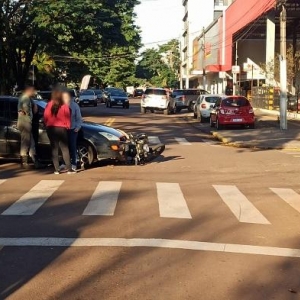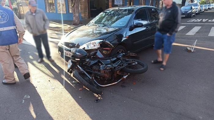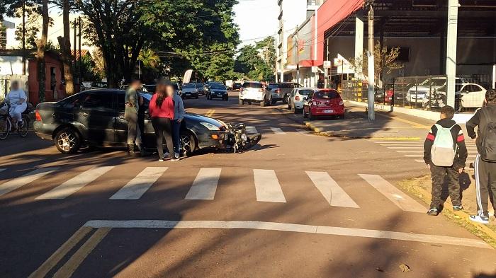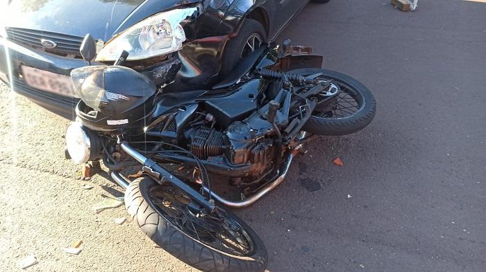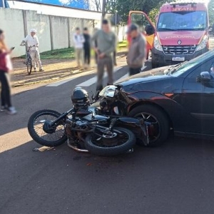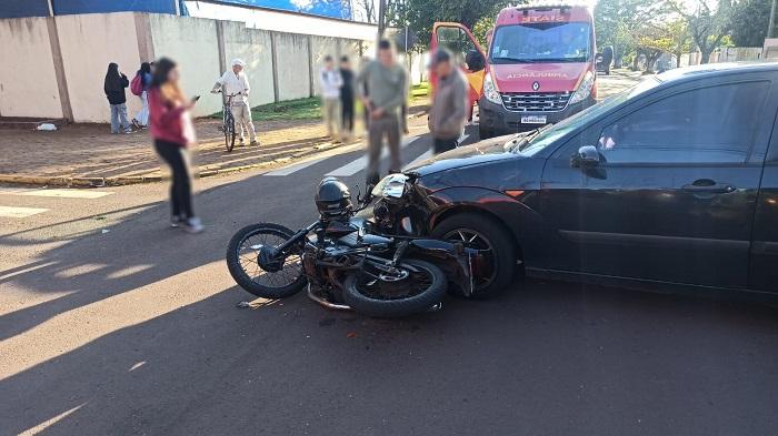 Um jovem motociclista de 18 anos foi encaminhado para a UPA no final da tarde desta sexta-feira após se envolver em um acidente feira com um veículo Ford Focus no cruzamento da Rua cerro Largo com Rua Paraná no Jardim Porto Alegre em Toledo.